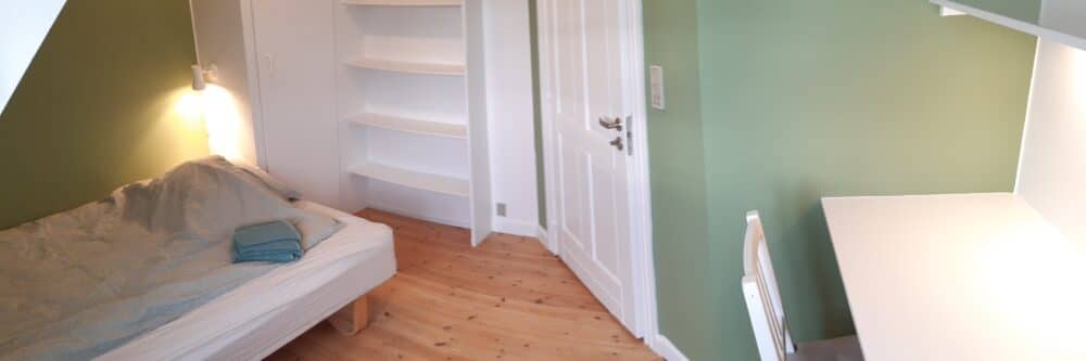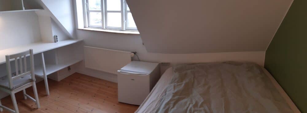På værelse 11 er der en 140cm dobbeltseng. Der skrivebord og hylder og skab til opbevaring.